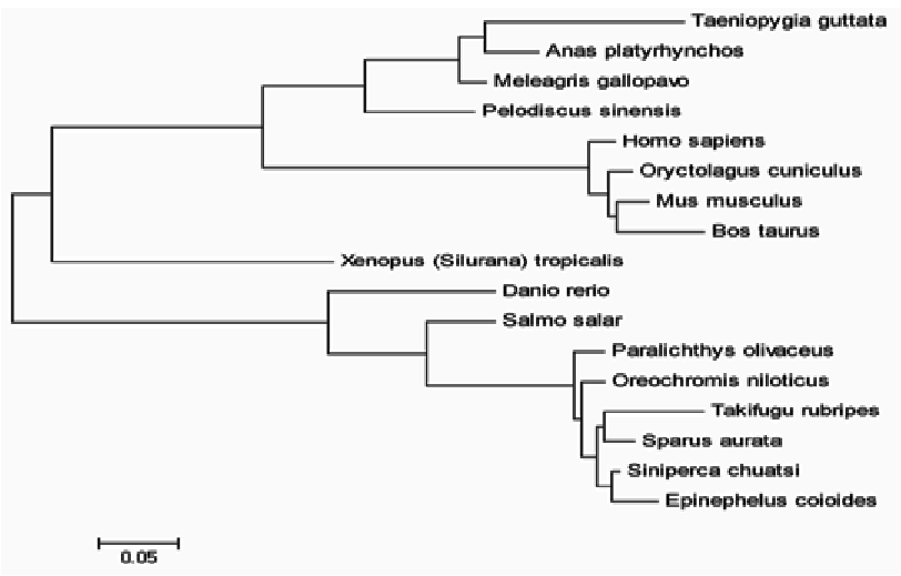 | Figure 4: Phylogenetic analysis of the S. chuatsi myogenin gene sequence relative to myogenin genes from other vertebrates. The deduced protein sequences were searched from Gene bank same as in Figure 3 and the phylogenetic tree was constructed with the neighbor-joining method in MEGA version 3.0 based on Poisson-corrected pairwise distances between protein sequences. Note S. chuatsi, Epinophelus coioides, Sparus aurata and Taklfugu rubripos are in the same branch. |
