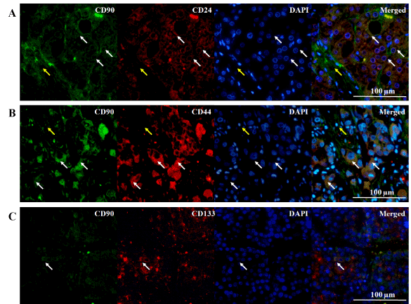 in hepatocellular carcinoma (A, B) Co-expression with CD24 and CD44 was observed in a majority of CD90+ neoplastic cells. CD90 (green), CD24 or CD44 (red), and nucleus (blue). White arrows indicated examples of CD24+/CD90+ cells. Yellow arrows showed that CD90+ stromal cells did not express CD24 or CD44. (C) The co-expression of CD90 and CD133 was rarely observed. CD90 (green), CD31 (red), and nucleus (blue). Arrows indicated their co-expression on neoplastic cells. |
