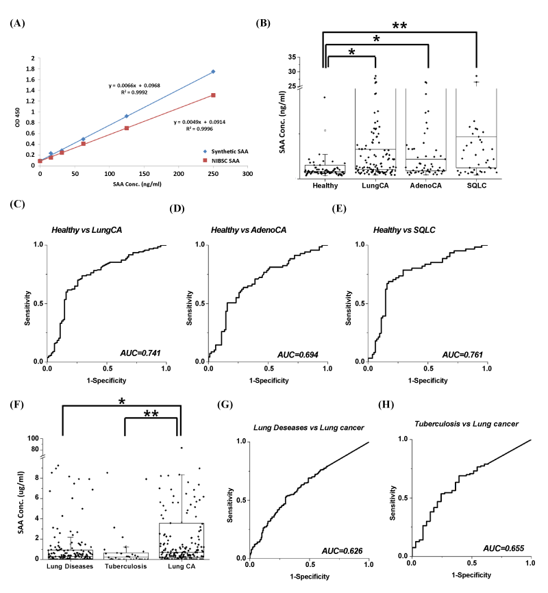 | Figure 3: Development of ELISA and clinical sample test (A) With the SAA monoclonal antibodies produced, ELISA system was developed. Standard curve on synthetic SAA and NIBSC standard SAA shows good activity of the SAA ELISA developed. (B) Total 239 clinical samples were tested with the ELISA; 82 healthy individuals and 157 lung cancer patients. A significant difference was observed between healthy individuals and lung cancer or healthy individuals and two lung cancer histological types; adenocarcinoma, or squamous lung cancer. (C, D, E) The Diagnostic ability was evaluated by ROC curve and its AUC value. (F) One hundred seventy seven sera from lung disease patients and 213 sera from lung cancer patients were subjected to ELISA test to verify the ability of the SAA to differentiate between lung cancer and other lung diseases. A significant difference was observed between lung diseases and lung cancer. Differential diagnostic ability from tuberculosis was evaluated and significant difference was confirmed. (G, H) The overall differential diagnostic ability is shown in an ROC curve. (* indicates P <0.05, ** denotes p<0.001 compared to each groups in analysis of significant variance). |