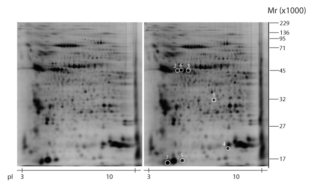 | Figure 3: SYPRO Ruby-stained 2DE gels (pH range 3-10) from the conditioned medium of non-treated ECPC-4 (Figure 3: left) and ECPC-4 treated with lipid A (500 ng/ml) (Figure 3: right) for 48 h. For detection of protein expression, 500 µg of protein was loaded to each gel. Protein molecular mass standards (y-axis) and pHs (x-axis) are shown. |