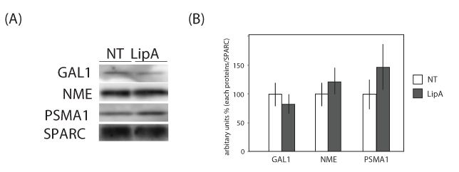 | Figure 4: Western Blotting of galectin-1, nucleoside diphosphate kinase A and proteasome subunit alpha type1 in the conditioned medium of non-treated and lipid A-treated ECPC-4. NT, medium of non-treated ECPC-4 conditioned for 48 h; LipA, medium of ECPC-4 with lipid A (500 ng/ml) conditioned for 48 h. GAL1: galectin-1, NME: nucleoside diphosphate kinase A, PSMA1: proteasome subunit alpha type1. SPARC was used as the internal control protein. (A) The levels of GAL1, NME, PSMA1 and SPARC in individual samples of each group were detected. (B) Graphical representation of the semi quantitative analysis. (mean ± S.E.M. of O.D. of bands). Data are presented as mean ± S.E.M. of 3 samples from each group. |