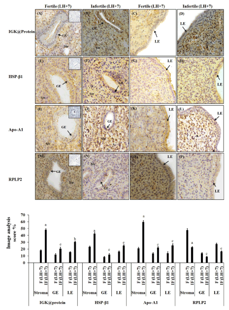 | Figure 4: Representative images (upper panel) showing immunohistochemical localization of IGK@ protein, HSPβ-1, Apo-A1and RPLP2 proteins in fertile (LH+7) and infertile (LH+7) human endometrium. For negative controls (see inset in A, E, I, M) mouse-IgG/ rabbit IgG was used in place of primary antibody. Lower panel shows image analysis of IGK@protein, HSPβ-1, Apo-A1, and RPLP2 in fertile and infertile endometrium. Staining intensity of all these proteins were quantified by image analysis software Image-Pro Plus 4.0 (Maryland, USA). Str (Stroma), GE (glandular epithilium), and LE (luminal epithelium). Magnification X 400, bar=25 μm, n=5 in all the groups. |