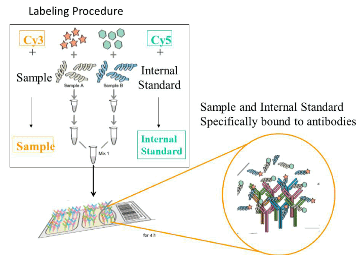 | Figure 1: Methodology for serum labelling procedure from kidney transplant patient differing in graft survival vs. normal controls. Proteins from kidney transplant serum at different stages of the disease (sample) vs. normal serum (control) were labeled with Cy3 or Cy5 dyes, respectively, and analyzed on an antibody microarray platform. |