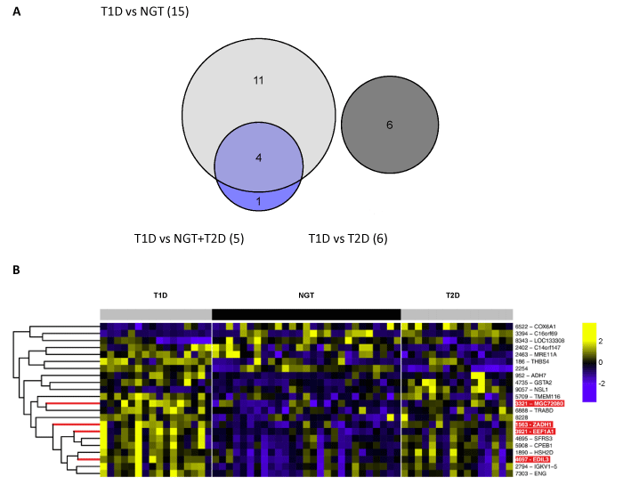 | Figure 2: ROTS detections. (A) Numbers and overlaps of the ROTS detections (FDR < 0.05) in the three comparisons: T1D vs NGT, T1D vs NGT+T2D, and T1D vs T2D. (B) A heat map representation of all these 22 proteins detected by ROTS. The columns show the total of 59 samples from three groups (T1D, NGT, T2D) and the rows correspond to the 22 detected proteins. The 4 proteins overlapped between T1D vs NGT and T1D vs NGT+T2D are highlighted in red: EEF1A1 (eukaryotic translation elongation factor 1 alpha 1), EDIL3 (EGF-like repeats and discoidin I-like domains 3), ZADH1 (PTGR2, prostaglandin reductase 2), and MGC72080 (MGC72080 pseudoprotein). The ZADH1 and MGC72080 were not found in original study [29]. The signal intensities were log2-transformed and autoscaled similarly as in the original study [29]. Yellow represents increase and blue means decrease in abundance. |