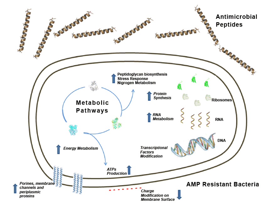 | Figure 1: Schematic bacterial cell and the resistance mechanisms to antimicrobial peptides (AMPs) elucidated until now. Arrows pointing upward indicated pathway up-regulation and arrows pointing down indicate pathways down-regulation. Brown helical structures show a poly-alanine antimicrobial peptide Pa-MAP and blue helical structures represent porines and membrane channels. Red dotted line represents charge modification in anionic bacterial cell surface. Metabolic pathways included energy and amino acid synthesis pathways. |