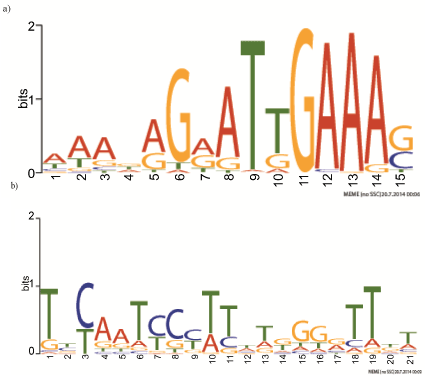 | Figure 4: Repeat consensus motif for CRISPR sequences. (a) Consensus motif for entire CRISPR sequence. Out of 391 sequences, 342 sequences were found in the consensus motif region. (b) Consensus motif for novel CRISPRs. Out of 33 novel CRISPRs, 31 CRISPRs sequences were found in the motif regions. |
