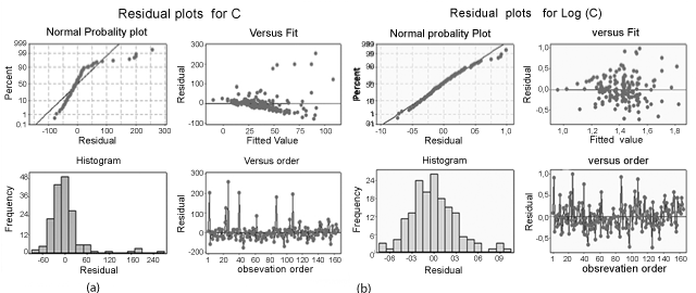 | Figure 1: Residual plots of (a) radon concentration and (b) logarithm of radon concentration. All measurements are shown. Each plot contains (I) percentage of residuals versus residual, (II) frequency distribution of the residuals, (III) residual versus fitted values according to C for (a) and log (C) for (b) and (IV) residual versus observation order. |