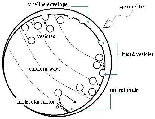 | Figure 1: Scheme showing the three main mechanisms associated to the initial events of oocyte fertilization. Sperm entry through the acrosomic reaction liberates the genetic material into the oocyte and triggers the local entrance of external calcium and the subsequent propagation of a calcium wave through the ooplasm. This process activates protein motors, that actively transport clusters of cortical vesicles towards the plasmatic membrane. Once fused, hyaline is released and initiates the gradual activation of the vitaline envelope until the shield against polyspermy is completed. |
