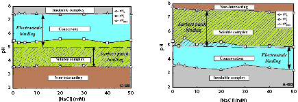| Figure 12: Interaction phase diagram of a) C-GB system and b) Agar-GB system clearly defining various interaction regimes prevailing in the solution. Note the soluble complexes were formed initially through SPB binding and later through EB. Electrostatic interactions continued to dominate mesophase formation following coacervation transition. Solid lines are guide to the eye only. Reproduced with permission from Elsevier [95]. |