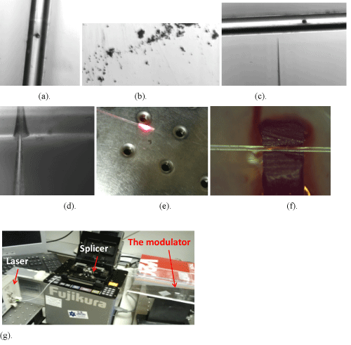 | Figure 1: Modulator fabrication steps. (a). Drilling the holes. (b). Image of the micro particles. (c). Insertion of the tip near the drilled fiber. (d). Insertion of the particles into the hole. (e). The constructed fiber. (f). The fiber in the magnet. (g). The experimental setup. |