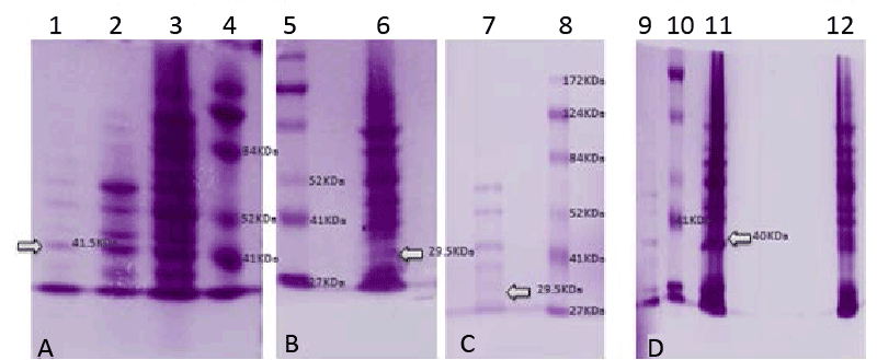 | Figure 5: SDS-PAGE for molecular determination of expressed proteins from E. coli. Panel A – peh; Panels B and C – celB; Panel D – celC; Lanes 1, 2, 7, 9, semi-purified proteins; Lanes 4, 6, 8, 12, Prosieve protein marker mixture; Lanes 3, 6, 10 crude peh, celB and celC protein extract, respectively, and Lane 12, crude extract of the negative control. Bands with molecular weights of approximately 29.5, 40 and 41.5 kDa are indicated in the representative lanes of peh, celB and celC, respectively. No bands in these ranges were detected in Lane 12 confirming the expression of the tested cloned genes. |