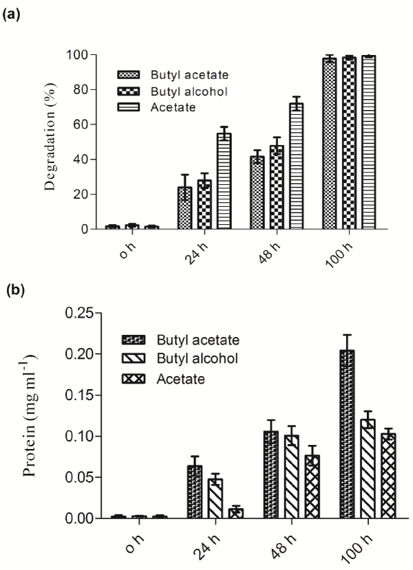 | Figure 5: Exponential growth rate (a) and total biodegradation (b) of Rhodococcus sp. strain MB-P1 in MSM supplemented with 2-hexanone metabolic products such as; butyl acetate; butyl alcohol; and acetate each with 15 mM concentration. Total biodegradation (%) was determined at 0, 24, 48 and 100 h of incubation and expressed as degradation percentage of the initial concentration of each substrates added. Similarly, the growth properties were determined and expressed in terms of total cell protein (mg ml-1). Values are presented as arithmetic mean of data obtained from experiments carried out in triplicate; error bars represent standard deviation. |