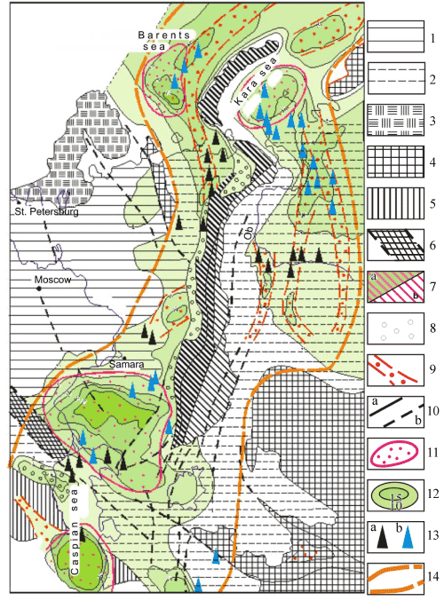 | Figure 3: Northern fragment of Ural-African intensive riftogenesis belt.1–4–Stabilized crustal blocks (cover and platform basement): 1-cover of ancient platforms (PZ, MZ); 2-cover of recent platforms (PZ-MZ); 3-Pre-Cambrian fold regions; 4-Phanerozoic fold regions; 5–6-Mobile regions: 5-basement of Mediterranean orogenic belt; 6-eastern terminus of Dniepr-Donets rift; 7–10-zones and regions of intensive continental riftogenesis: 7-linear suture zones with intensive sedimentation (а), mantle magmatism (b) and subsequent folding (Ural-Novaya Zemlya fold system); 8-foredeeps with intensive extension and downwarping; 9-linear riftogenesis (rift) zones; 10-faults: а-proven, b-assumed; 11-regions of polygonal riftogenesis; 12-thickness of sedimentary deposits; 13-oil (а) and gas (b) fields; 14-approximate boundary of Ural-African intercontinental belt. |