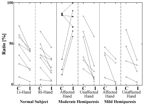 | Figure 4: The ratio of the cerebral cortex area with significant activation to that of the entire imaged portion of the hemisphere (the extent ratio) of all subjects. During normal hand grasping of healthy subjects and unaffected-hand grasping of patients, the contralateral hemisphere was predominantly activated. In contrast, the ipsilateral hemisphere was extensively activated during moderately paretic hand grasping. C, contralateral hemisphere; I, ipsilateral hemisphere; Lt, left; Rt, right; Filled squares, patients with bilateral activation; Filled triangles, patients with ipsilateralpredominant activation. |
