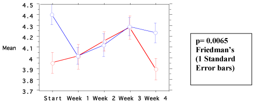 | Figure 2: The average motor score in the upper extremities (UE) shoulder abduction, elbow extension, elbow flexion, wrist dorsiflexion and flexion. Data are reported for patients, during the 4-AP (blue line) and placebo (red line) arms, at the start of treatment and after 1 week, 2 weeks, 3 weeks and 4 weeks of treatment with one standard error bars. |