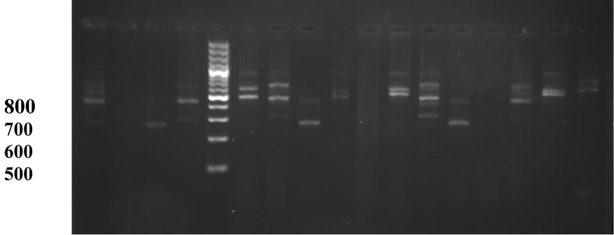 | Figure 2: ITS-PCR amplification patterns of Pectobacterium and Dickeya on agarose gel. Lane1, P. carotovorum subsp carotovorum strain 74;2, P. carotovorum subsp carotovorum strain 42;3, P. carotovorum subsp carotovorum strain 40;4, P. carotovorum subsp carotovorum strain Ecc10;5, L, molecular weight markers (bp) (100 bp, Cinnagen, Tehran, Iran);6, P. carotovorum subsp carotovorum strain E2;7, P. atrosepticum strain Eca52;8, D. chrysanthemi strain Hd5;9, P. carotovorum subsp carotovorum strain Ech33;10, P. carotovorum subsp carotovorum strain Ecc62;11, P. carotovorum subsp carotovorum (Type strain;Ecc11523);12, P. carotovorum subsp carotovorum strain CA3;13, D. chrysanthemi strain Hd3;14, P. atrosepticum strain49;15, P. carotovorum subsp carotovorum Ecc16;16, P. carotovorum subsp carotovorum. |