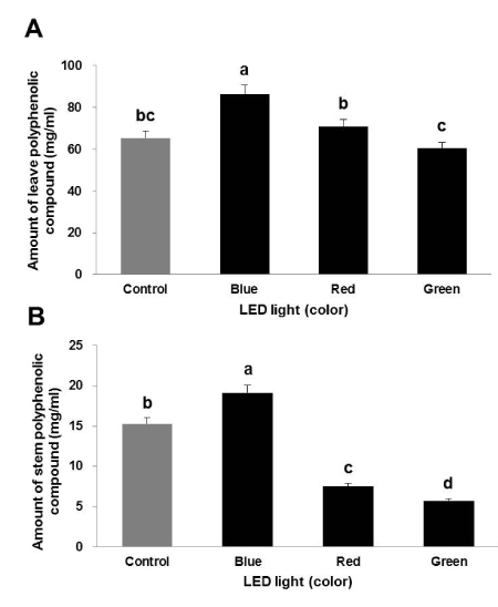 | Figure 2: The content of total polyphenolic compounds in the leaves and stems of tomato grown for 21 days under light-emitting diode (LED) lights. Control represents broad-spectrum-white LED. Error bars represents the standard deviation (n=3). Bars with the same low case letter are not significantly different (p>0.05), as assessed by Tukey’s honestly significant difference. |