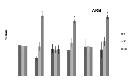 | Figure 2: Percent change in UAE, serum creatinine and eGFR after 36 months of ARB therapy among the three genotypes, stratified by the presence or absence of nephropathy, based on ACEI/D genotypes. |