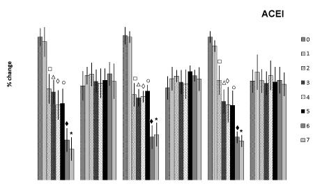 | Figure 5: Percent change in UAE, serum creatinine and eGFR after 36 months of ACEI therapy among the seven risk scores, stratified by the presence or absence of nephropathy. |