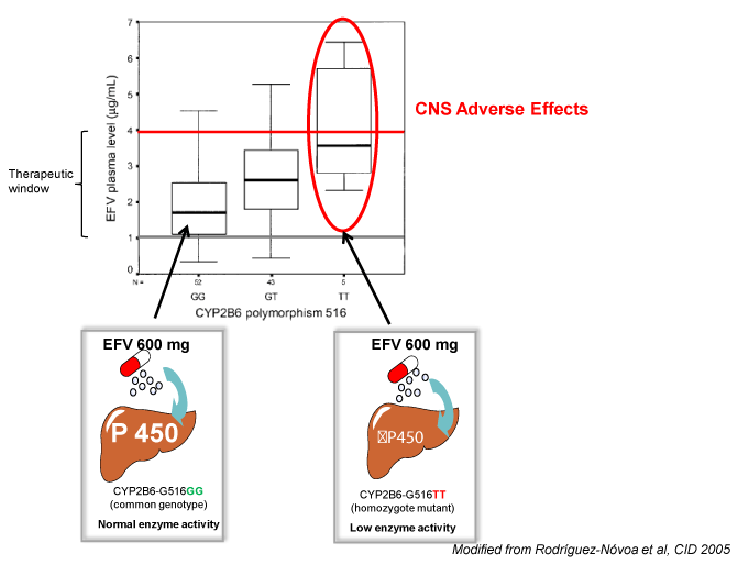 | Figure 2: EFV plasma levels and polymorphisms in the CYP2B6 gene. The change 516G>T ([Gln172His]) in CYP2B6 results in a lower enzyme activity of CYP2B6 which leads to a greater EFV plasma levels. EFV plasma levels above 4μg/mL are associated to higher incidence of central nervous system toxicity. The graphic shows mean EFV plasma levels according to CYP2B6-516 genotype. EFV: Efavirenz; GG: common genotype; GT: heterozygote genotype; TT: homozygote polymorphic genotype; CNS: central nervous system. |