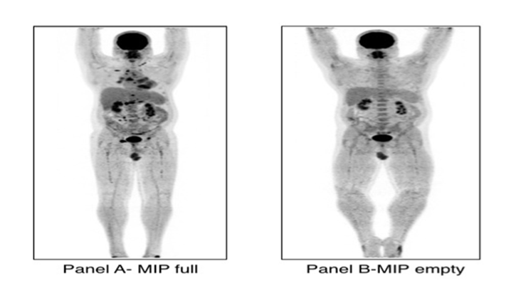 FDG-PET/CT MIP (Maximum Intensity Projection) images of the same patient