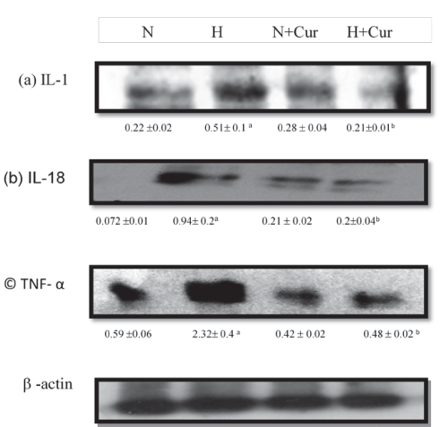 | Figure 7: Western blot analysis showing the effect of curcumin on the expression of pro-inflammatory cytokines (a) IL-1 (b) IL-18 and (c) TNF-α in the lungs of rats exposed to hypobaric hypoxia at 7620 m for 6 h. The enhanced levels of these pro-inflammatory cytokines under hypoxia were significantly down regulated by curcumin treatment indicating the potent anti-inflamatory activity of curcumin under hypobaric hypoxia conditions. The densitometry analyses were represented below their respective western blot analysis. Values are mean ± SD (n=6). aP < 0.001 compared with Normoxia (0 h) group. bP < 0.001 compared with hypoxia (6 h) group. N=Normoxia, H=Hypoxia, Cur=Curcumin. |