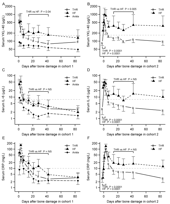 | Figure 6: Figure 6A, 6C and 6E shows changes of YKL-40, IL-6 and CRP in patients in cohort 1. Figure 6B, 6D and 6F shows changes of YKL-40, IL-6 and CRP in patients in cohort 2. Dotted grey lines mark upper boundaries of normal levels of the cytokines. The initial rise in all the cytokines within the first day in patients with hip fractures are documented by p-values for patients in cohort 2 at the bottom of the figure. The elevated levels of YKL-40 from day 14-42 in patients with hip fractures compared to patients with total hip replacements in cohort 1 and 2 are documented by p-values at the top of figures 6A and 6B. |