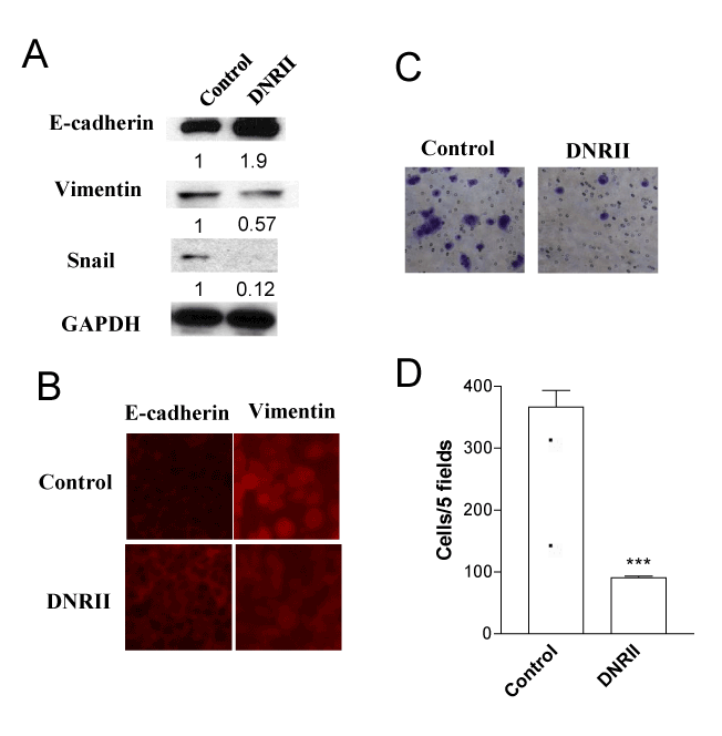 | Figure 4: Autocrine TGF-ß signaling is necessary for the progression of EMT in NMuMG-ST cells. (A) Cells from exponential cultures of the control and DNRII cells were plated in T-25 flasks. After culturing for 4 days, cell extracts were used for Western blot analysis to detect the expression of E-cadherin, Vimentin and Snail. The density of each band was quantified with The Image J software and divided by the density of the corresponding GAPDH band. The ratio is presented under each blot after normalizing the values for control as one unit. (B) Control and DNRII cells were grown on cover slips in a 24-well plate till 80% confluence. Cells were fixed, permeabilized, blocked and incubated with an anti- E-cadherin or anti-vimentin antibody followed by the incubation with fluorescent dye-tagged secondary antibody. (C) and (D). In a Boyden chamber, 25,000 cells in serum-free medium were seeded in the upper chamber. The lower chamber contained the medium with 10% of FBS as chemoattractant. After incubation for 16 hours, cells were removed from the upper surface of the chamber membrane and stained for the migratory cells at the lower surface of the chamber with HEMA3 staining solution. Cells were counted under a microscope (***p<0.005). |