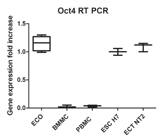 | Figure 10: Quantitative analysis of the OCT4A expression in the ECO cells. The RNA from the cells was reverse transcribed into cDNA, which was then amplified by RT qPCR with the primers for the OCT4A. The amplification was calculated in relation to GAPDH and compared relative to the ESC expression. Labels: ECO – patients’ samples (n=6); PBMC – peripheral blood mononuclear cells (n=6); BMMC – bone marrow mononuclear cells (n=6); ESC – cultures of the human embryonic stem cells H1, H7, H9 (n=3); ECT -cultures of the human testicular embryonal carcinoma cells NT2D1 (n=1). Statistical significance was accepted at the p < 0.001. The samples were run in triplicates. |
