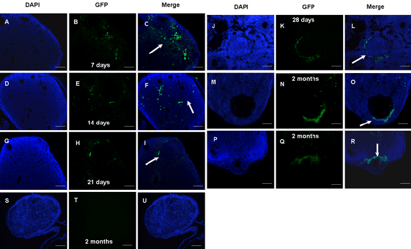 | Figure 3: Macroscopic appearance of recipient ovaries 7 days to 2 months following transplantation with GFP-transfected hAECs. (A-F) GFP staining dots was shown in recipient ovaries 7-14 days following transplantation with GFP-transfected hAECs, whereas no GFP signal in follicles. Follicles containing GFP-positive (green) oocytes were shown in recipient ovaries 21 days (G-I), 28 days (J-L) and 2 months (M-R) following transplantation with GFP-transfected hAECs. (S-U) Oocytes in recipients without hAECs transplantation showed a lack of GFP signal after a 2 month-recovery period. Arrows indicated the GFP distribution pattern in ovaries. Blue, DAPI immunofluorescence. Scale bars, 200 μm (S-U), 100 μm (A-R). |
