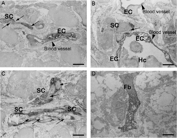 | Figure 7: Immunoelectron microscopic detection of engrafted GFP+ cells. Transplanted donor-derived GFP+ cells were stained with anti-GFP antibody and visualized by DAB (dark dots). Differentiation of transplanted donor cells into Schwann cells (arrows in A-C), endothelial cells (arrowheads in A and B), and fibroblasts (D) were clearly evident. SC, Schwann cell; EC, endothelial cell; Hc, hematocyte; Fb, fibroblast. Bars=2μm. |