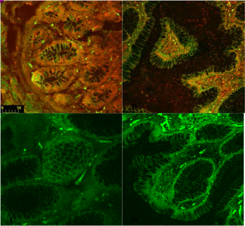 The protein localization of APC and hDlg proteins in (A) normal colonic crypts and (B) polyp tissue. Note the normal basolateral membrane localization of hDlg in the polyp structure (B) (arrowhead) which is also evident in the normal crypts (A). Panel (C) shows an abnormal crypt (arrow) exhibiting loss of apicobasal polarity and the panel (D) depicts abnormally developing villi from the colon of this tubulovillar case giving rise to early polyps. Note that hDlg is mislocalized due to the architectural disturbances in the dysplastic cells of crypts and villi in these premalignant tissues, which lose their apico-basal polarity and not due to the loss or degradation of APC protein per se ( B), which tends to accumulate in the lumen of the gut and crypts (red arrows). Figures A and C are acquired at 35X whereas; Figures B and D are at 20X. |