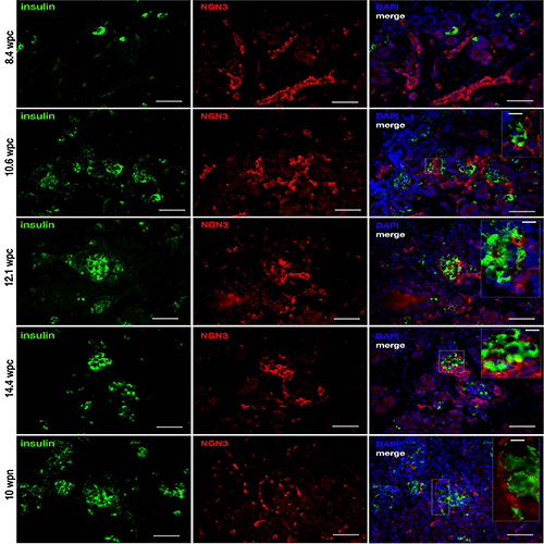 | Figure 9: Insulin (green) and neurogenin3 (NGN3, red) expression during the first trimester (8.4, 10.6, 12.1, 14.4) and post natal (10 wpn). At 8.4 wpc NGN3 cells are filamentous, elongated and are scattered throughout the section and arranged in branch-like formations. The NGN3 positive cells are not associated with the scattered insulin positive cells. At 10.6 wpc, NGN3 cells surround the first islet-like cell clusters in a wave-like pattern and the number of NGN3 positive cells appears to peak at this time point. At 12.1 and 14.4 wpc, while the NGN3 cell number decreases these cells are more closely associated with the forming islets and are found around and within the forming islet. Post natal (10 wpn), a few NGN3 cells are evident near and in the islet as well as scattered throughout the pancreas section. There is no evidence of insulin and NGN3 co-expression at any of these time points. Areas denoted by a box are shown at higher magnification (inset). Scale bars are 50 and 10 μM respectively. |