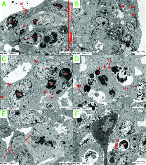 | Figure 5: TEM showing the cells in C57BL/6 EBs. (A) n: nucleus, nu: nucleolus, ld: lipid droplets, dv: digestive vacuole, m: well-developed mitochondria. (B) desmosomal like junction (arrows head). (C) n: nucleus and nu: nucleolus, dv: digestive vacuole, rb: residual body, desmosmal like junction (arrows head), m: poorly developed mitochondria. (D) m1: juvenile mitochondria, m2: elongated mitochondria, apv: autophagocytic vacuole, tight junction (arrows head), ly: lysosme. (E) m: well-developed mitochondria, rer: stalk of rough endoplasmic reticulum.(F) ld: lipid droplets, pv: phagocytic vacuole. |