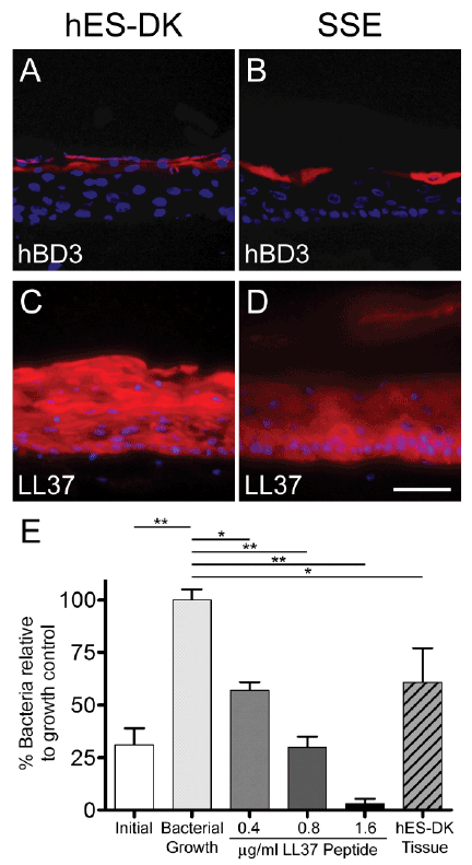 | Figure 5: Functional host defense peptides are expressed and appropriately localized in hES-DK tissue, as confirmed by antimicrobial activity in vitro against S. carnosus. Indirect immunofluorescent detection (red) of the host defense peptides hBD3 (A and B) and LL-37 (C and D) in stratified tissue generated from hES-DK and epidermal keratinocytes. Hoechst 33258 stain was used to visualize nuclei (blue). Results are representative of three independent experiments. Scale bar represents 50 µm. Extent of bacterial growth in the absence or presence of antimicrobial peptide or hES-DK tissue onditioned medium (E). Compared to the initial bacterial concentration, significant growth was observed in the bacterial growth control samples. The addition of LL37 peptide and conditioned medium significantly reduced the level of bacterial growth as compared to untreated control samples (*p<0.05; **p<0.01). Data represent mean ± standard deviation. |