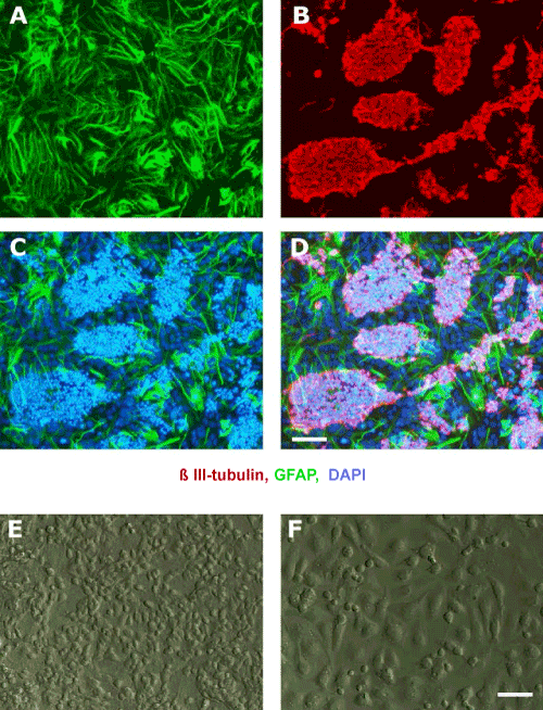 | Figure 1: Differentiating neural stem cell progeny and isolating neuronal cells. (A-D): Representative micrographs of the neuroblast assay (NBA) culture, 4 days after switching to growth factor free medium and stained for the astrocyte marker; GFAP (A), neuronal marker; β III-tubulin (B) and counterstained with DAPI (C). The colonies of β III-tubulin positive neuronal cells are on top of the astrocyte monolayer (D). (E-F): The NBA culture before (E) and after (F) shaking. After shaking the majority of the top neuronal cell clusters are detached from the underlying astrocytic cell monolayer. Scale bars = 50 μm. Abbreviations: GFAP= Glial fibrillary acidic protein, IR= Immunoreactive, DAPI= 4’,6-Diamidino-2-Phenylindole. |