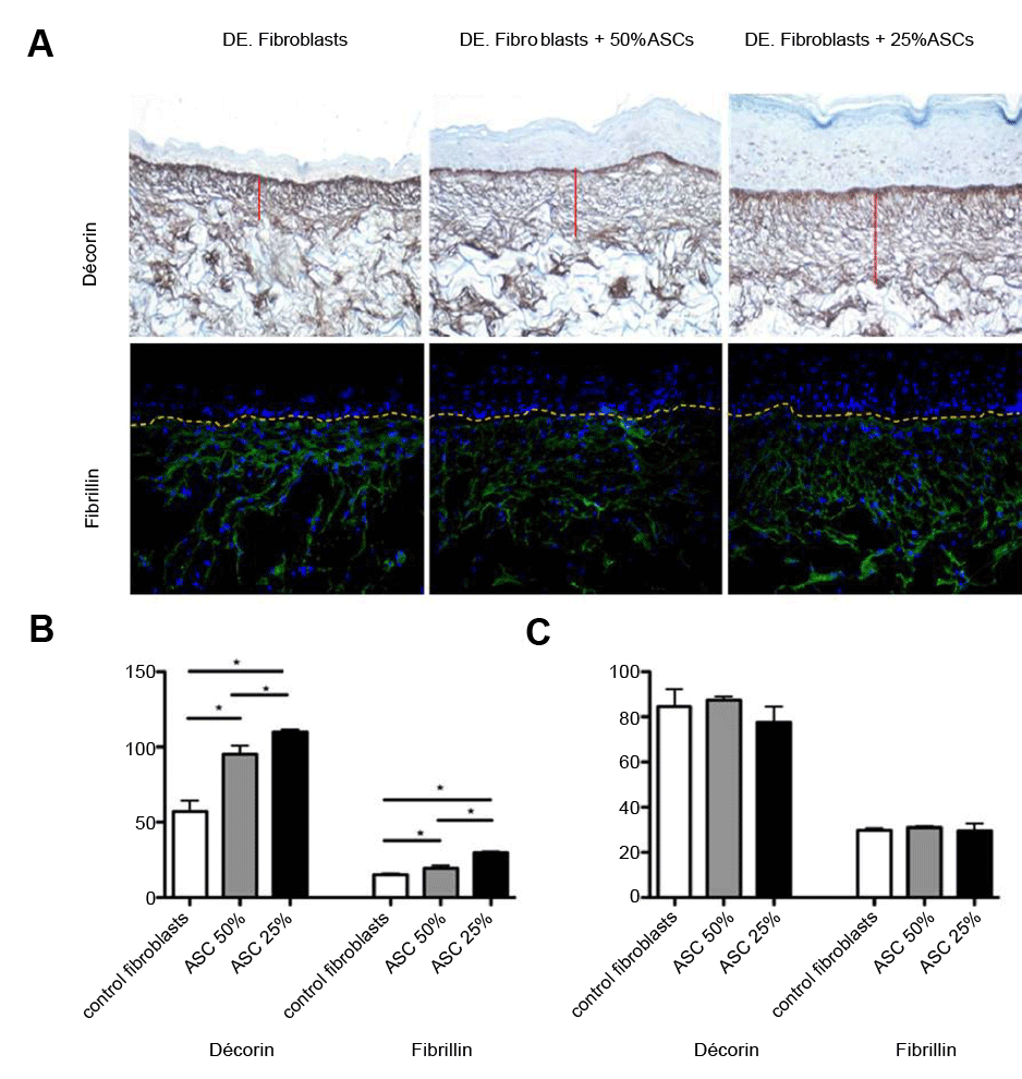 | Figure 3: Effects of ASCs on decorin and fibrillin-1 synthesis in the DE of the SE. A: Morphological analysis using decorin and fibrillin expression on day 42. B: Thickness of “papillary-like” dermis (µm) labeled by decorin and percentage of area labeled with fibrillin in relation to the total area of dermis on day 42. This “papillary-like dermis” appeared thicker on D42 in reconstructed skin containing ASCs with the greatest effect when 25% ASCs were added to 75% fibroblasts. Indeed, since the thickness of the “papillary-like dermis” was equal to 109.9 µM with 25% ASCs (p = 0.05), 95.22 µM with 50 % (p = 0.05) and only 57.07 µM without ASCs. The percentage of the area labeled with fibrillin relative to the total area of the dermis increased significantly when ASCs are added: 29.8% with 25% ASCs, 19.3% with 50% ASCs and 15.2% without ASCs (p = 0.05). C: Thickness of “papillary-like” dermis (µm) labeled by decorin and percentage of area labeled with fibrillin in relation to the total area of dermis on day 100. When the duration of culture was prolonged (to 100 days), dermal homeostasis had been reached and no difference was observed between the different conditions, concerning both the thickness of the “papillary-like dermis” and fibrillin expression. Means calculated for 3 fields in 3 different samples for each condition. |