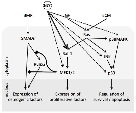 | Figure 5: Proposed role of NO in the osteogenic, proliferative and apoptotic pathways in MSC. The bone morphogenetic proteins (BMP) induce the phosphorylation of SMADs and facilitate their translocation in the nucleus. The SMADS contribute to expression of the key osteogenic factor Runx2 (left side of the panel). Growth factors (GF) such as fibroblast growth factor and the extracellular matrix (ECM) activate, among other pathways, the small GTPase Ras and the Ras-Rafpathway. Ras controls different signaling pathways, including different MAPkinases and p53 (right side of the panel). BMPs, GFs and the ECM regulate the gene expression required for osteogenic differentiation, proliferation and survival or apoptosis of MSC (thin solid arrows). Depending on the cell, MEK1/2 block the activation and nuclear translocation of SMADs (thick line with rombus), thus inhibiting expression of Runx2 (71). Nitric oxide radicals cause a transiently elevated phosphorylation of MEK1/2, p38MAPK, JNK, and p53 (thin dashed arrows) involved in proliferation, survival and apoptosis. Low NO activates c-Raf (thick arrow), which facilitates the activation of MEK1/2, and may thus interfere with SMAD- and Runx2-dependent regulation of expression in MSC. |