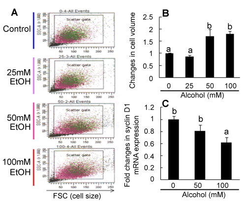 | Figure 5: A and B: Changes in cell size of immortalized HL1-hT1 cells. Cells were cultured in the proliferation medium without and with different concentrations of alcohol for 4 days. Values are mean ± SEM. N = 4 sets of cell cultures in each group. Bars with different letters in panel B are statistically different (p<0.05). C: Changes in cyclin D1 expression by immortalized HL1- hT1 cells. Cells were cultured in the proliferation medium without and with different concentrations of alcohol for 24 h. Values are mean ± SEM. N = 5 sets of cell cultures. FSC=forward side scatter. Bars with different letters are statistically different (p<0.05). |