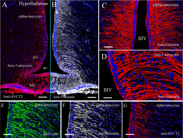 | Figure 3: Tanycyte distribution and SVCT2 immunoreaction in hypothalamic cells. Tanycytes are specialized hypothalamic glial cells that can be classified as alpha and beta-tanycytes. The tanycytes located in the dorsal walls of the third ventricle are classified as alpha tanycytes, which are involved in neurogenic activity (stem-like cells). Beta-1 tanycytes are located in the lateral lower area of the ventricle and develop elongated cell processes that form a bow through the arcuate nucleus and reach the lateral sulcus of the infundibular region in the lateral hypothalamus. A. SVCT2 and B. vimentin expression analysis in hypothalamic alpha and beta tanycytes. Detailed tanycyte structure and vimentin immunoreaction are observed in C and D. The fluorescence analysis of vimentin (red) and nuclei (Topro in blue) was performed using confocal spectral microscopy (Zeiss 780 equipment), tile scanning, Z-stack imaging and rendering analysis (process of generating an image from a model). E-G. Alpha-tanycyte distribution after infection with adenovirus-GFP (E) or fluorescence analysis of vimentin (F) and SVCT2 (G). IIIV, Third ventricle; AN, Arcuate nucleus; ME, Median eminence. Scale bars in A and B, 800 μm; in C and D 400 μm; and in E-G, 200 μm. |