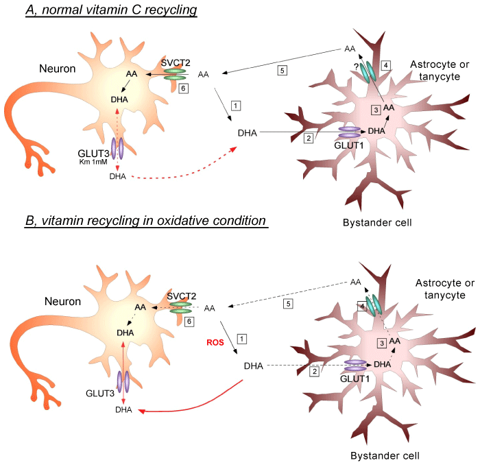 | Figure 5: Vitamin C recycling and proposed interaction between neurons and astrocytes in normal or oxidative stress conditions of the brain. A. Under physiological conditions, reactive oxygen species (ROS) are constantly generated in the CNS. In these conditions, ROS oxidizes AA to DHA (A1), which preferentially enters the astrocyte by GLUT1 (A2). Inside the astrocyte, DHA is again reduced to AA (A3), and is then released into the extracellular space by a yet unknown mechanism (A4). The extracellular AA then enters the neuron via SVCT2 (A5/6), exerting its antioxidant effect and thereby protecting neurons against cell death. Moreover, under normal conditions, we postulate that GLUT3 expression by neurons is involved mainly in DHA efflux. Increased intracellular DHA concentration in the neuron inhibits glycolysis, increases PPP activity, consumes glutathione and increases the influx of lactate. This adaptive mechanism changes the normal metabolism of the neurons in response to the accumulation of DHA [19]. B. In pathophysiological conditions, ROS is massively generated (B1), resulting in increased extracellular DHA concentrations and subsequent DHA entry into astrocytes. However, given the large amount of oxidizing species, the astrocyte will not be able to efficiently reduce DHA to AA (B3), resulting in less AA efflux into the extracellular environment (B4). Subsequently, AA enters the neuron through SVCT2 (B5/6), bringing about a decrease in intracellular antioxidant protection due to its lower degree of uptake by the neuron. Simultaneously, the large extracellular generation of DHA promotes its entry into neurons via GLUT3 (red arrow). Finally, the massive incorporation of intracellular DHA may promote neuronal death by a yet unknown mechanism. |
