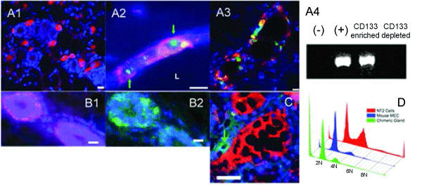 | Figure 2: Human cancer cells identified in the tumor-free mixed mammary outgrowths are hormonal responsive, secrete human milk proteins in the mammary ducts and do not show increased ploidy. A1) Human-specific immunocytochemical staining for CD133 (red) shows CD133-positive NTERA2 cells present within the confines of the fat pad containing regenerated mammary ducts. A2) Human-specific fluorescent in situ hybridization (green, nuclear; identified with green arrows) and human-specific immunocytochemical staining for CD133 (red) shows NTERA2 cells present within the mammary outgrowths. A3) CD133-positive NTERA2 cells (red) differentiate into ERα (green) luminal epithelial cells. A4) PCR shows human specific Y chromosome present in NTERA2 cells prior to transplantation (+) as well as in the CD133enriched fraction obtained by magnetic sorting but not in normal mouse mammary epithelial cells (-) and the CD133depleted fraction. B1-B2) Basal cells express human K14 (red) and mouse K14 (green) in consecutive sections of the same duct. C) Immunocytochemical staining of mixed mammary outgrowth for human α-lactalbumin (green) and mouse caseins (red). D) Flow cytometry of propidium iodide stained cells demonstrate that mixed mammary outgrowths (green) do not contain a greater proportion of cells with abnormal ploidy as compared to cultures of mouse mammary epithelial cells (blue) or NTERA2 (red). All sections are counterstained with DAPI (blue). Scale bars A1) 20 μm, A2) and A3) 15 μm, B1) and B2) 10 μm, and C) 25 μm. Figure from Rosenfield and Smith, 2013. |
