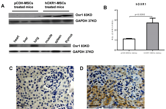 | Figure 4: hOXR1 expression in vivo after hOXR1-MSC injection into the mice. (A) hOXR1 expression in kidney and other organs by western blot. (B) hOXR1 mRNA expression in kidney by QPCR (n=3 in each group). (C-D) Representative image of hOXR1 expression in mouse kidney tissue section of pCDH-MSCs treated mice (C) and hOXR1-MSCs treated mice (D). (Original magnification 400X, scale bars=50 μm). shown images are representative of 5 samples per group. |