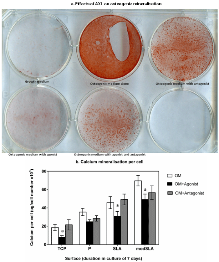 | Figure 3: Effects of AXL signaling disruption on extracellular matrix calcium mineralisation were assayed. (a) hMSC cultured in different conditions for 14 days and stained with a 2% Alizarin Red S were imaged on a flatbed scanner. GM showed no stain. OM stained intensely. Antagonist stained positive though intensity was lesser than OM alone. The agonist had caused a strong decline in staining intensity compared to control and OM with antagonist. The combination of both media supplements led to an intermediate stain. (b) Cells were cultured on all surfaces with OM, OM with agonist or OM with antagonist for 7 d; calcium quantities and cell numbers assayed. Control OM induced mineralisation in an order of modSLA > SLA > P > TCP. The additions of agonist significantly decreased mineralisation on each surface respective to controls; but did not inhibit the process. This effect was most prominent on the TCP. The addition of antagonist did not increase calcium mineralisation on all surfaces; P and modSLA cultured cells displayed a small decrease in presence of antagonist. Error bars show mean ± 1SD; N=3, n=3. a= p<0.05, control vs. condition for any surface. |