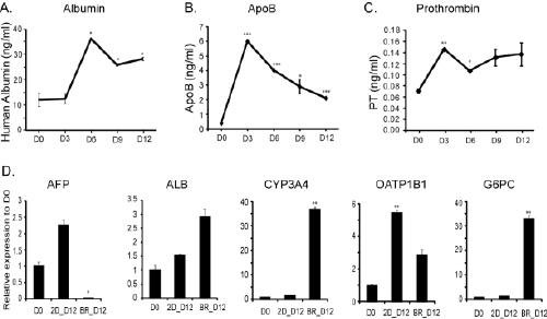 | Figure 6: Functional assessment of iHeps cultured in the hollow fiber bioreactor cartridge with continuous flow. (A, B, C) Plasma proteins albumin, apolipoprotein B, and prothrombin secretion by iHeps at indicated time points are shown. The mean values with standard deviations are presented in the graphs. (D) Relative gene expression to input day 0 iPSC-hepatocytes was calculated and values are shown in the graphs with standard deviations. Note the significant reduction of AFP level in cells cultured on a continuous flow condition. 2D: two-dimensional culturing in dish; BR: bioreactor culturing. Three independent experiments were performed and representative data is shown. |