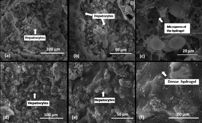 | Figure 3: SEM images of hepatocytes in the 3D constructs with different concentrations of gelatin in the gelatine/alginate/fibrin hydrogel 1 h after the 3D printing: (a)- (c) 10% (w/v) gelatin in the gelatine/alginate/fibrin hydrogel with different magnifications; (d)-(f) 20% (w/v) gelatin in the gelatine/alginate/fibrin hydrogel with different magnifications. |