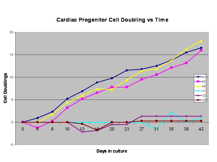 | Figure 1: pCPCs can be cultured and expanded. Growth rate comparison between 6 different cell lines derived from atrium and ventricle of 3 individual mice age 3, 4 and 6 months. pCPCs from the atrium (A1, A2,and A3) cultured in expansion medium began to proliferate after day 7th and expanded beyond 40 days but not the cells from ventricle (V1, V2,and V3), which did not grow well. |