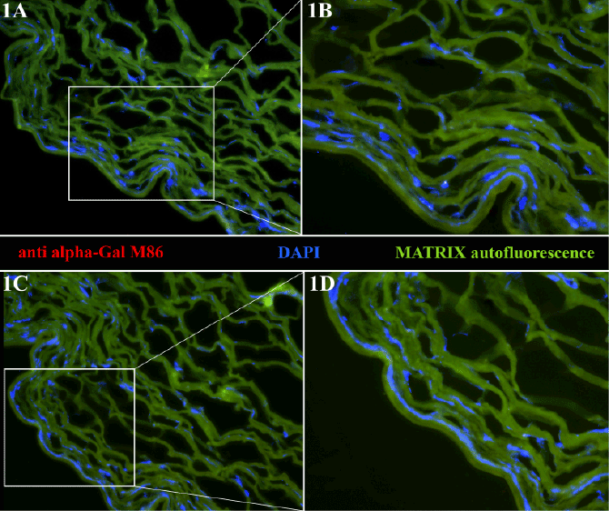 | Figure 1: Alpha-Gal epitope distribution in two different samples (A-B and C-D) of glutaraldehyde-fixed tuna cornea material by immunofluorescence analysis. Magnification 20× for A and C; magnification 40× for B and D. Antialpha- Gal monoclonal antibody M86 - red; Nucleic acid material - blue; Matrix autofluorescence - green. |
