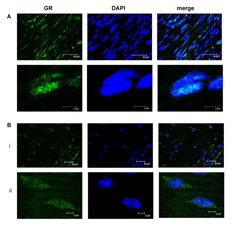 | Figure 4: Distribution and tissue subcellular localisation of GR protein within human myometrium by fluorescence confocal microscopy. GR protein localisation and expression in non-pregnant (A) and pregnant non-labouring sections of human myometrium (upper uterine sections are shown in B; lower segment pregnant non-labouring sections not shown). The left panels show GR protein staining visualised using a FITC conjugated secondary antibody (stains green). Nuclear DNA was defined by counterstaining with DAPI (stains blue) as shown in the middle panels. Colocalisation is illustrated by merging the images as shown in the right panels. Corresponding control reactions for each of the tissue sections were negative as they showed no immunofluorescence staining above background (not shown). |
