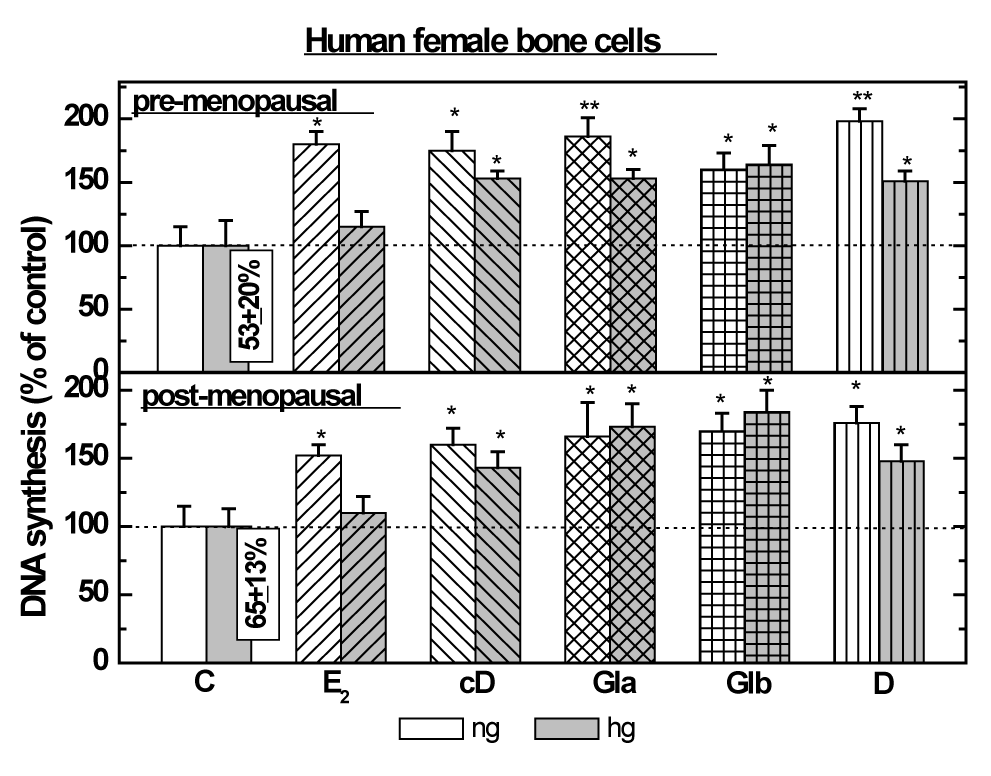 | Figure 2: Stimulation of CK specific activity by different phytoestrogens and E2 in primary bone-derived cells, from pre- and post- menopausal women, grown at different glucose concentrations; either normal (NG; 22mM) or high (HG; 44mM gray bars) glucose concentrations. Bone cells were cultured, treated and assayed for CK activity as described in Materials and Methods. Cells were treated for 24h with vehicle or 30nM E2 or 300nM of cD, Gla or Glb or 3000nM of D. Results are means ± SEM for triplicate cultures from 5 women/ group for each group. Control means of CK specific activity were 28.6±6.5 and 24.6±4.0nmol/min/mg protein, for pre- and post-menopausal women respectively. Experimental means compared to control means: *, P <0.05; **, P < 0.01; ***, P < 0.001. Means of cells at HG+ estrogenic compounds vs. cells at NG+ estrogenic compound: #, P <0.05; ##, P < 0.01. |